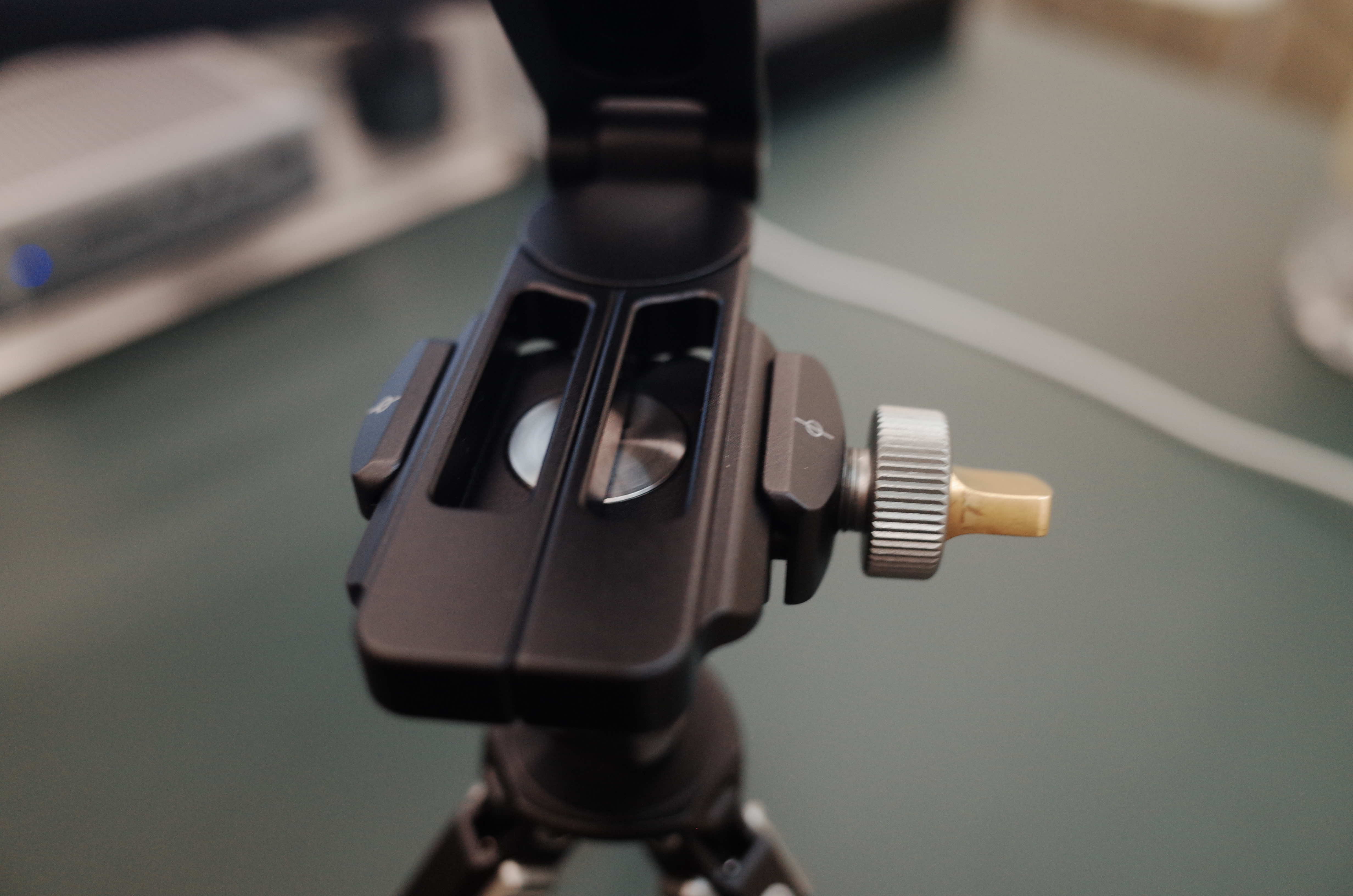 결합 방식은 매우 간단하다. 삼각대에 볼헤드를 결합하고 그 볼헤드에 거치대를 결합하는 방식으로, 거치대의 다리 부분을 자세히 보면 사진과 같이 볼헤드에 맞물릴 수 있도록 설계되어있다.