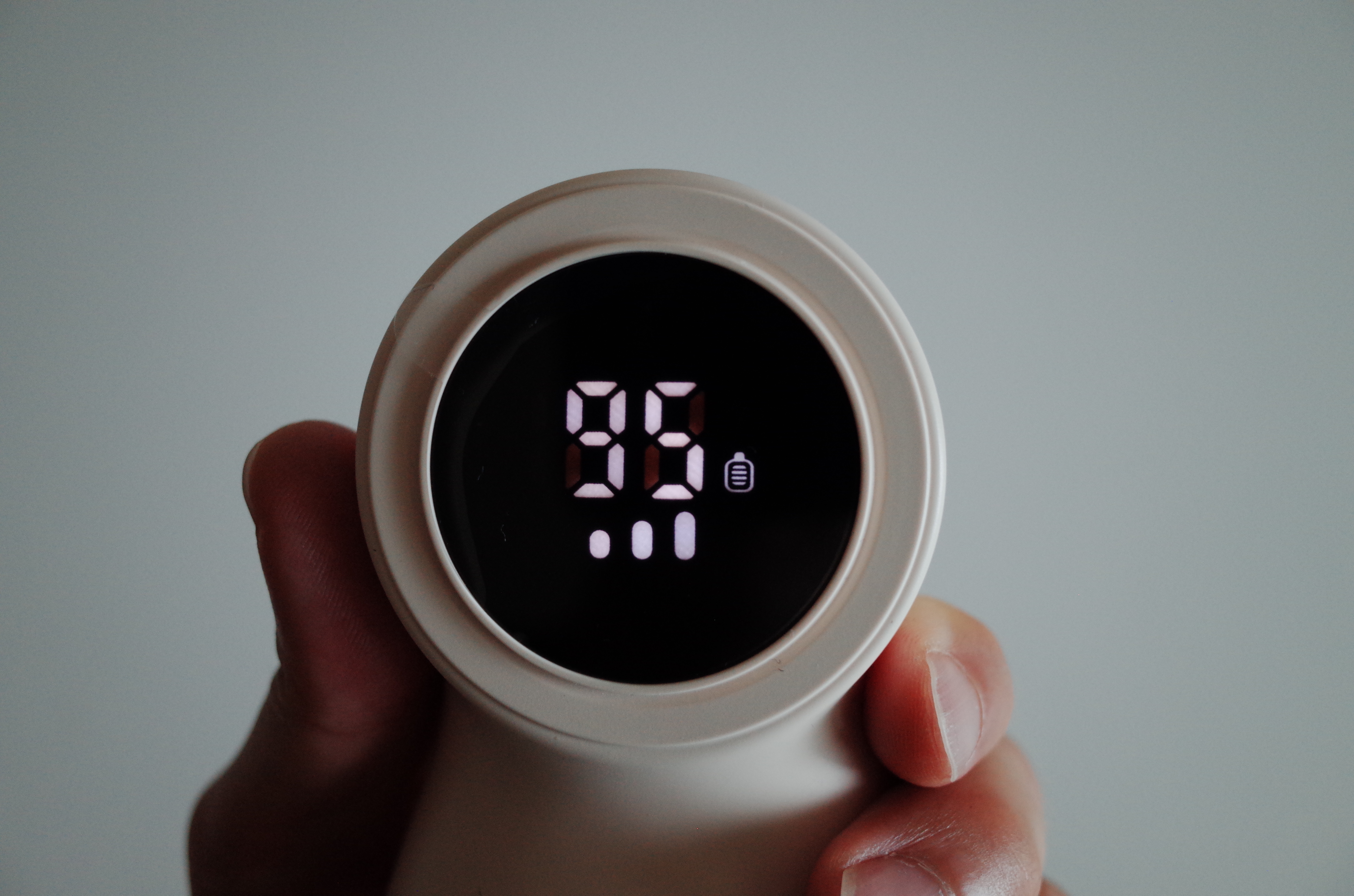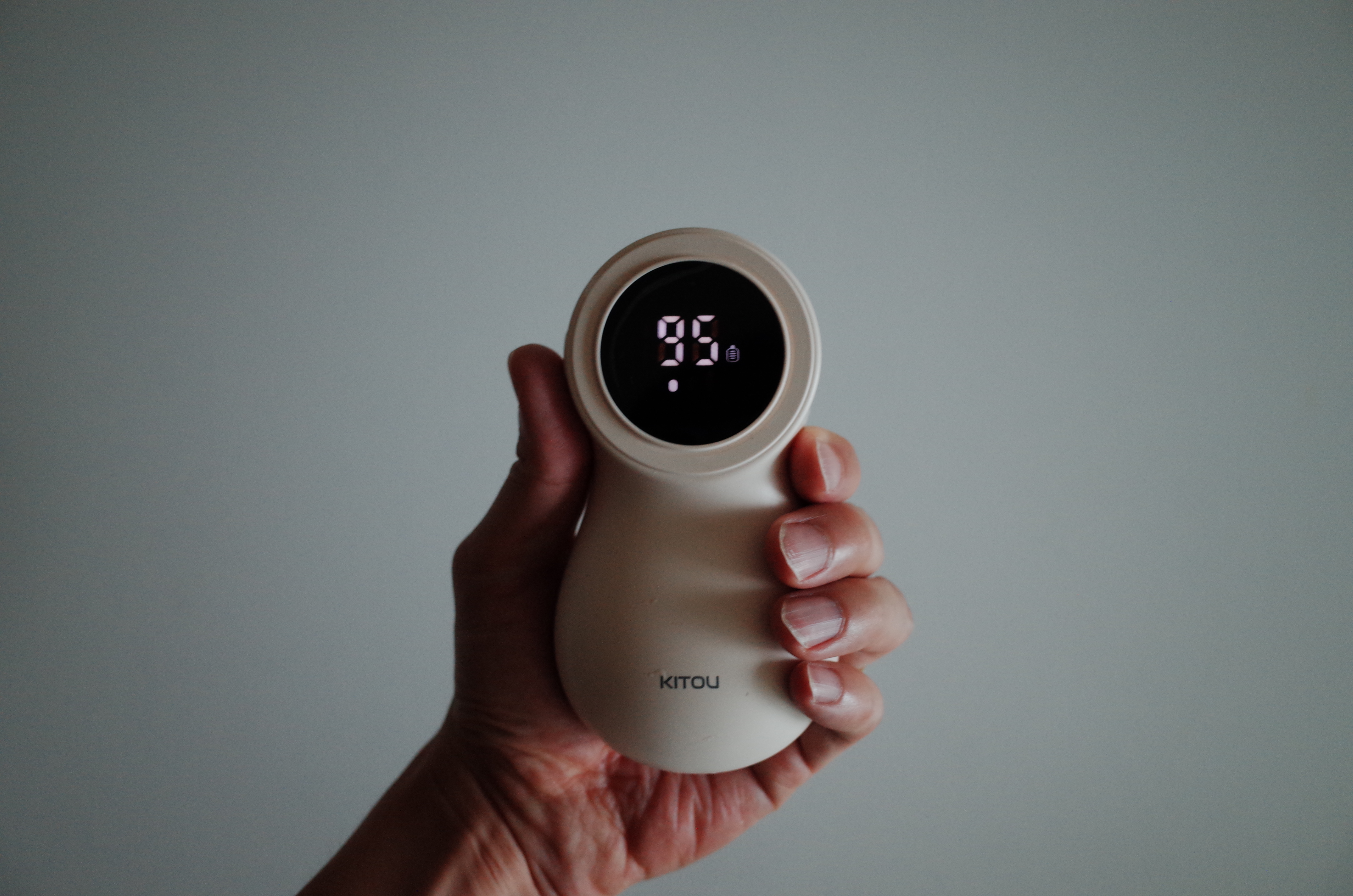 제품의 정면은 이렇게 생겼다. 마치 오뚜기 모양의 8 자 형태로 되어있으며, 검은 부분은 LCD창이 한눈에 볼 수 있게 되어 있고, 손잡이 부분엔 로고가 귀여운 사이즈로 부담스럽지 않게 적혀있다.
