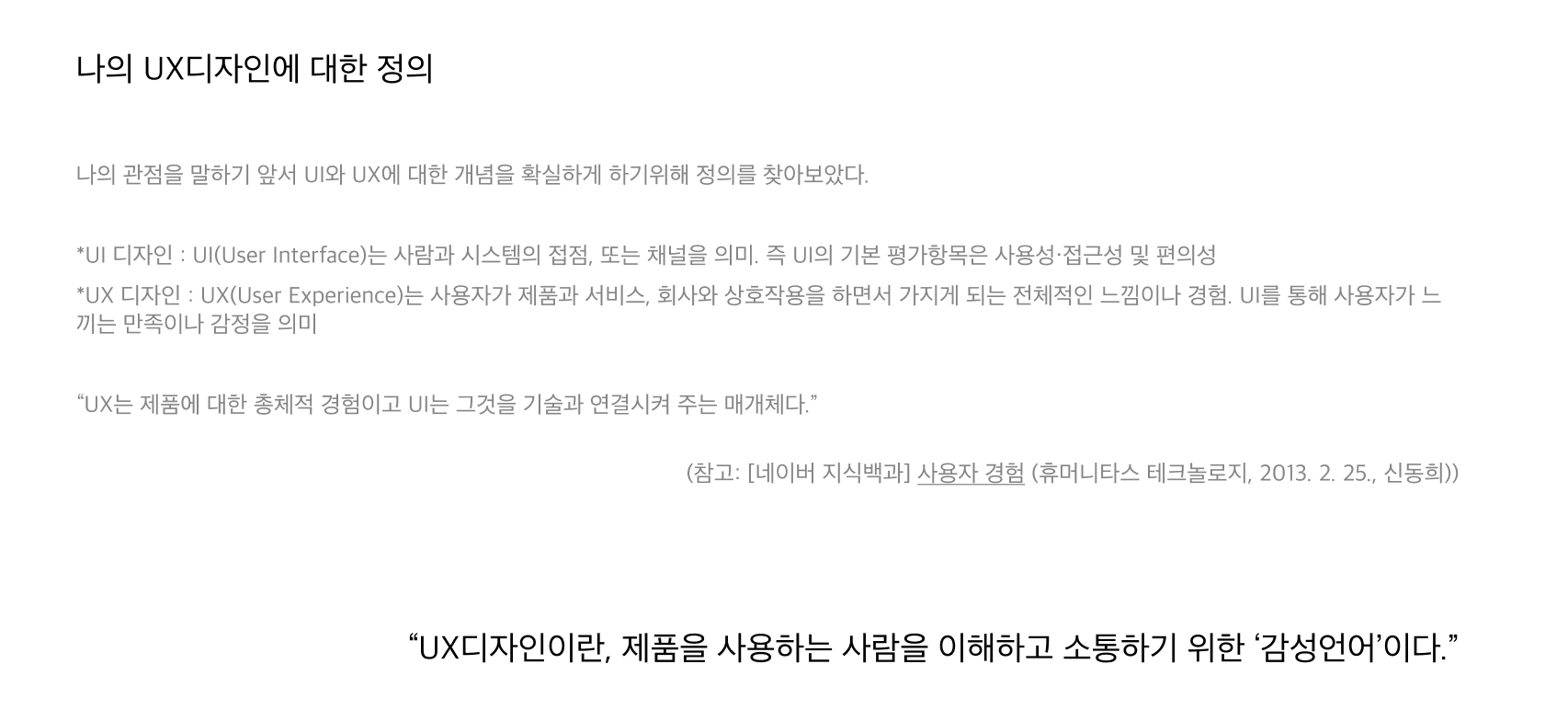 이처럼 UIUX 디자인은 일정한 범위나 명확한 정의를 내리긴 어려운 영역인 것 같다. 그러나 그만큼 각자의 논리에 의해 나름의 정의를 내릴 수 있는 영역이며, 나 또한 이를 통해 나만의 정의를 내려보았다.