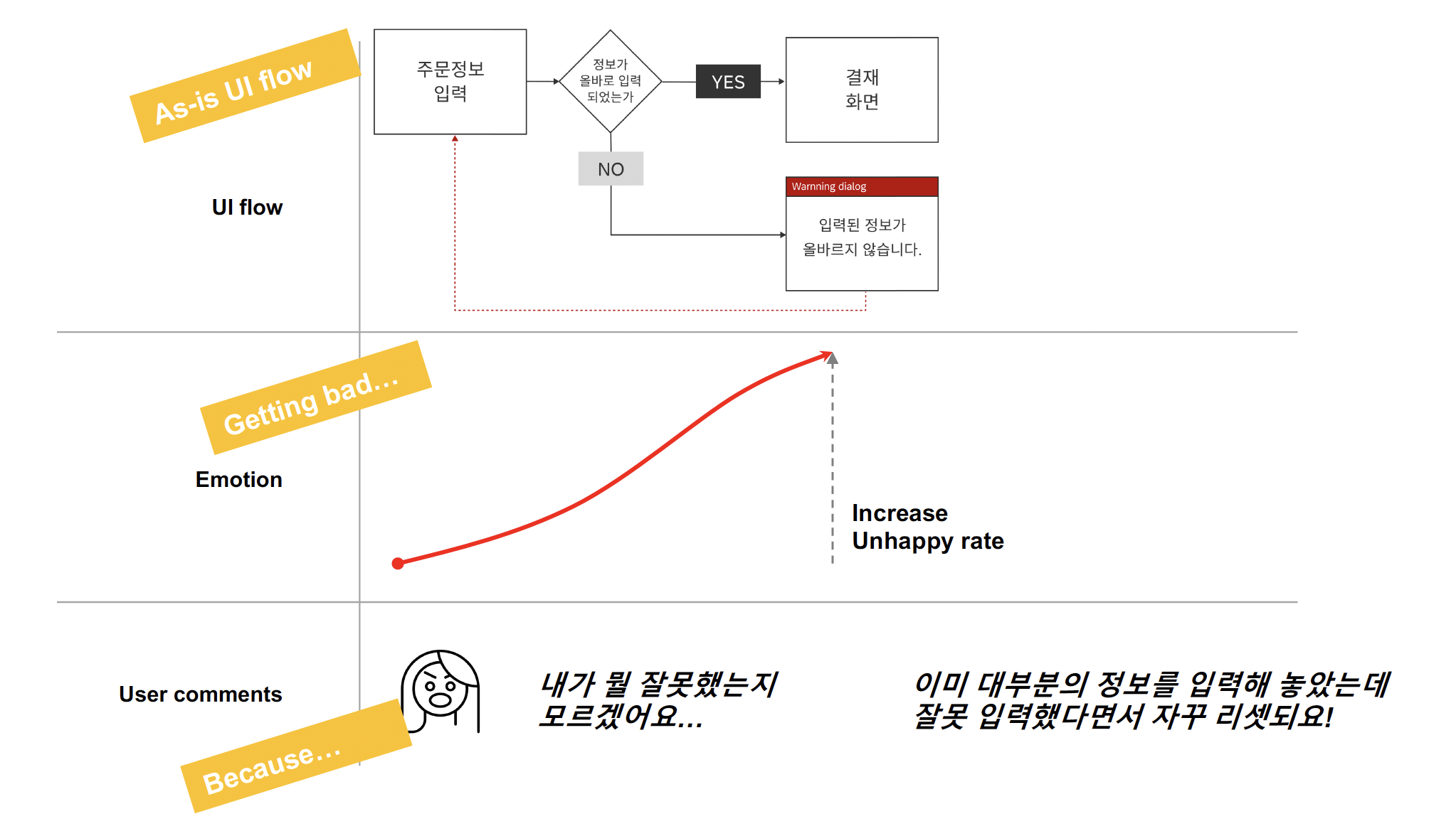 사용자가 과업을 수행하며 하는 행동 / 감정 / 상호작용점(Touch Point)을 시간 순서대로 정의
