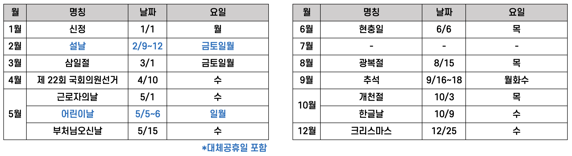 대체 공휴일은 2월 설날이랑, 5월 어린이날이 주말이랑 겹쳐서 월요일이 추가로 휴일인데,